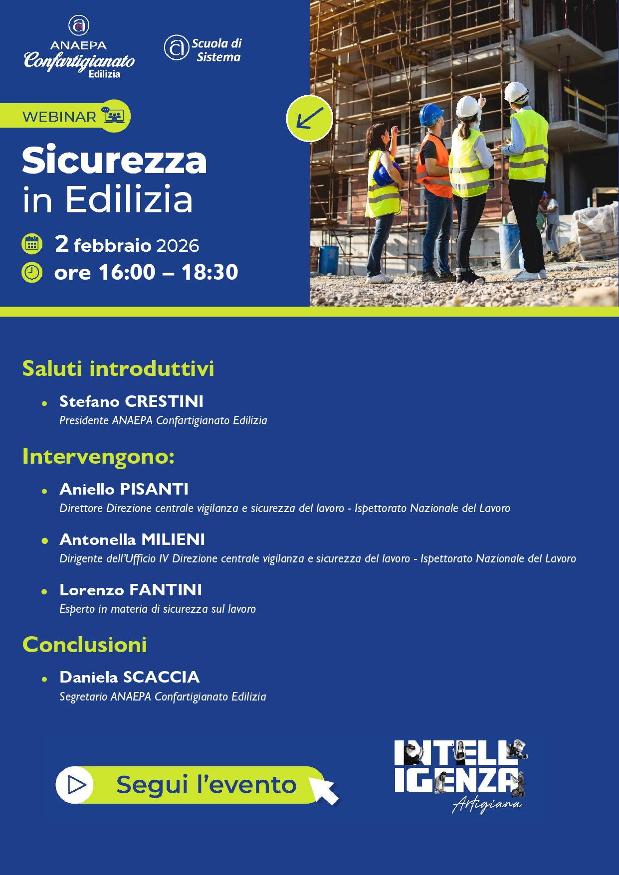 ANAEPA – Confartigianato Edilizia promuove un webinar dedicato ai temi della salute e sicurezza nei cantieri edili, in programma lunedì 2 febbraio 2026, dalle ore 16.00 alle 18.30.