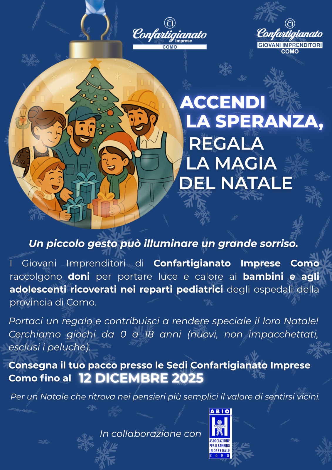 Il Movimento Giovani Imprenditori di Confartigianato Imprese Como promuove l’iniziativa “Accendi la speranza, regala la magia del Natale”, organizzata in collaborazione con ABIO Como ODV e dedicata ai bambini e agli adolescenti ricoverati nei reparti pediatrici degli ospedali della provincia di Como.