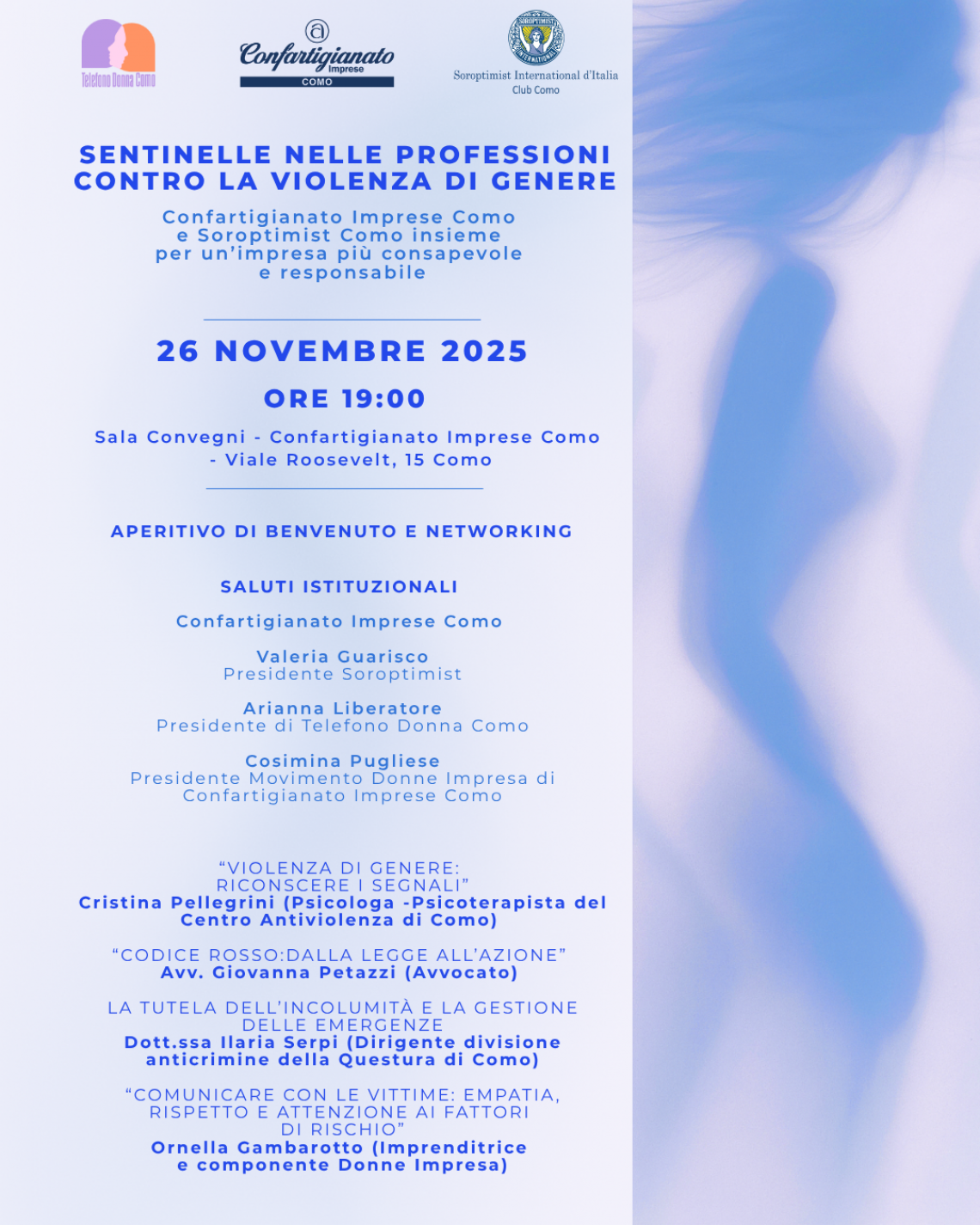 In occasione della Giornata internazionale per l’eliminazione della violenza contro le donne, Confartigianato Imprese Como e Soroptimist International Club Como, in collaborazione con Telefono Donna Como, Centro Antiviolenza di Como, promuovono un importante momento di riflessione e confronto aperto a imprese, professionisti e cittadini: