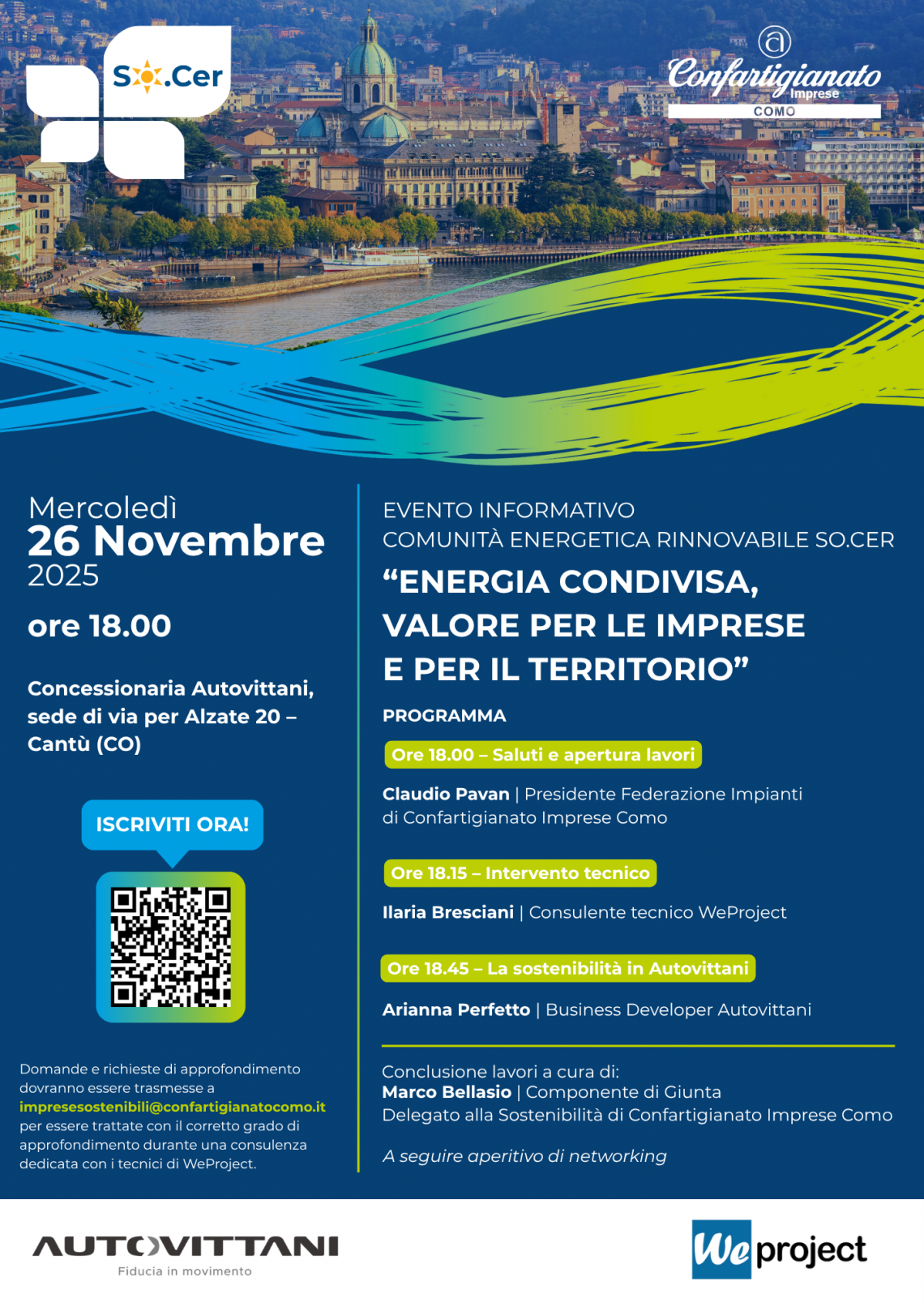 Dopo i saluti di Claudio Pavan, Presidente della Federazione Impianti di Confartigianato Imprese Como, seguiranno gli interventi tecnici di Ilaria Bresciani (WeProject) e Arianna Perfetto (Autovittani), con la conclusione affidata a Marco Bellasio, Delegato alla Sostenibilità di Confartigianato Como.