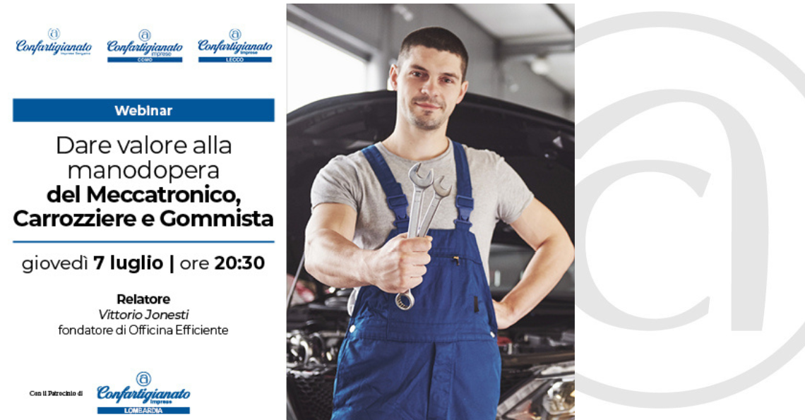 Per aiutare le imprese del comparto autoriparatori a districarsi nella corretta gestione delle officine, i Rappresentanti del settore autoriparazione delle territoriali di Como, Bergamo e Lecco, organizzano un webinar a partecipazione gratuita, con il patrocinio di Confartigianato Lombardia, dal titolo “Dare Valore alla Manodopera del Meccatronico, Carrozziere e Gommista”